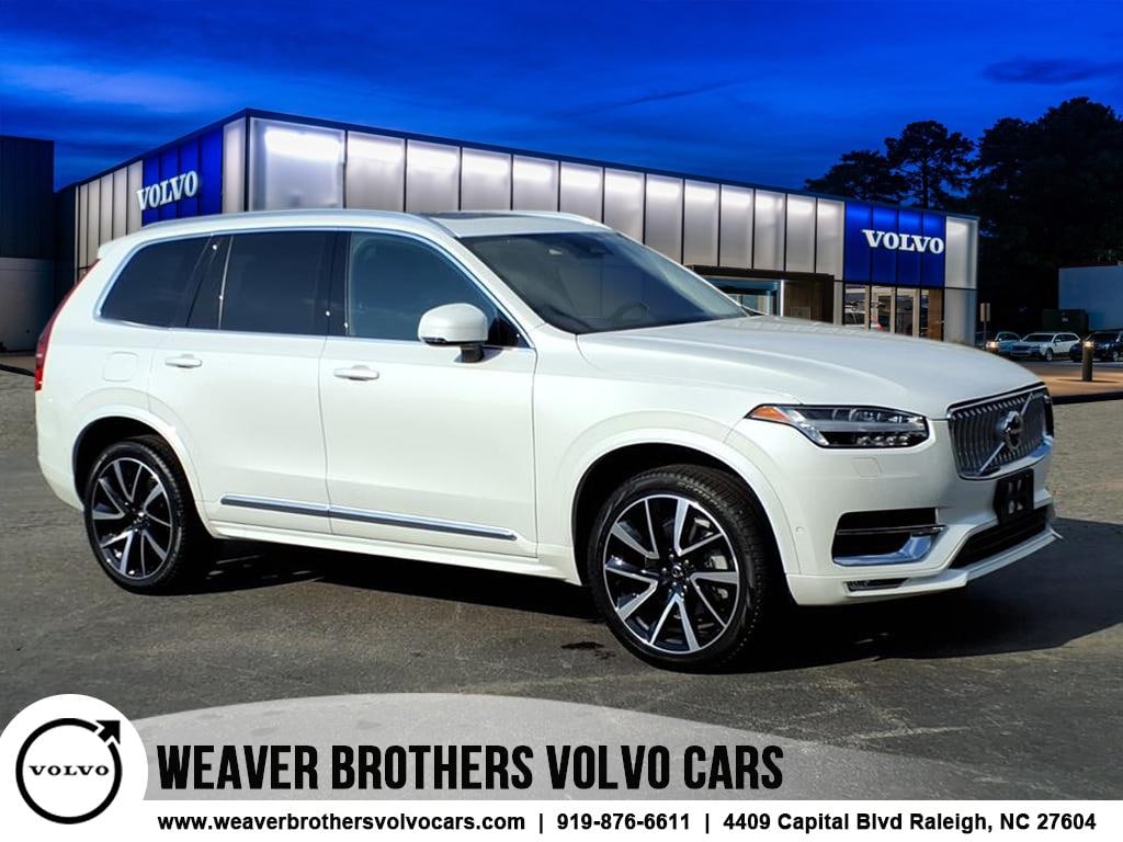 White 2024 Volvo XC90 B5 Plus AWD Automatic with Geartronic 2.0L I4 Turbocharged DOHC 16V LEV3-ULEV70 AWD, Charcoal Leather, 10 Speakers, 3rd row seats: bucket, 4-Wheel Disc Brakes, ABS brakes, Air Conditioning, Alloy wheels, AM/FM radio: SiriusXM, Anti-whiplash front head restraints, Apple CarPlay, Auto High-beam Headlights, Auto-dimming door mirrors, Auto-dimming Rear-View mirror, Automatic temperature control, Brake assist, Bumpers: body-color, Delay-off headlights, Driver door bin, Driver vanity mirror, Dual front impact airbags, Dual front side impact airbags, Electronic Stability Control, Emergency communication system: Volvo Cars App w/4 Year Subscription, Exterior Parking Camera Rear, Four wheel independent suspension, Front anti-roll bar, Front Bucket Seats, Front Center Armrest w/Storage, Front dual zone A/C, Front fog lights, Front reading lights, Fully automatic headlights, Garage door transmitter: HomeLink, Genuine wood dashboard insert, Genuine wood door panel insert, Headlight cleaning, Heated door mirrors, Heated Front Bucket Seats, Heated front seats, Heated rear seats, Heated steering wheel, Illuminated entry, Integrated rear child seats, Knee airbag, Leather Shift Knob, Leather Upholstery, Low tire pressure warning, Memory seat, Navigation System, Occupant sensing airbag, Outside temperature display, Overhead airbag, Panic alarm, Passenger door bin, Passenger vanity mirror, Power door mirrors, Power driver seat, Power Liftgate, Power moonroof, Power passenger seat, Power steering, Power windows, Radio data system, Radio: High Performance Audio System, Rain sensing wipers, Rear air conditioning, Rear anti-roll bar, Rear dual zone A/C, Rear fog lights, Rear reading lights, Rear seat center armrest, Rear window defroster, Rear window wiper, Remote keyless entry, Security system, Speed control, Speed-sensing steering, Split folding rear seat, Spoiler, Steering wheel mounted audio controls, Tachometer, Telescoping steering wheel, Traction control, Trip computer, Turn signal indicator mirrors, Variably intermittent wipers, Wheels: 20" 10-Spoke Black Diamond Cut Alloy, AWD, Charcoal Leather.